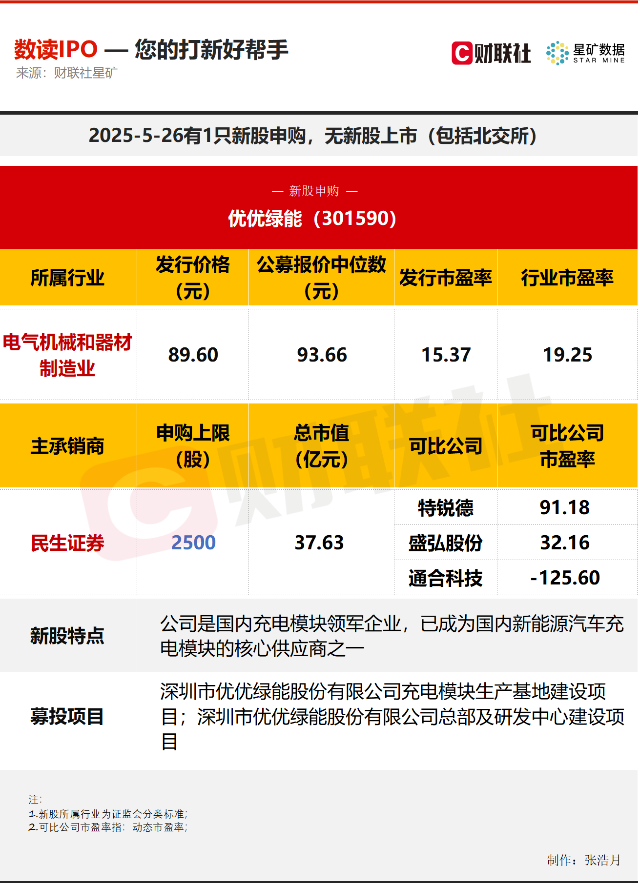 财联社5月26日电,今日有1只新股申购,为创业板的优优绿能;无新股上市。优优绿能是国内充电模块领军企业。