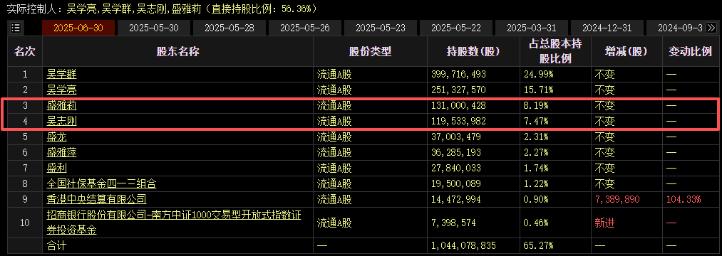 小财注:吴志刚、盛雅莉均为桃李面包实际控制人且互为一致行动人。截至2025年半年度末,吴志刚位列桃李面包第四大股东,持股1.2亿股,占总股本的7.47%,盛雅莉位列第三大股东,持股1.31亿股,占总股本的8.19%。