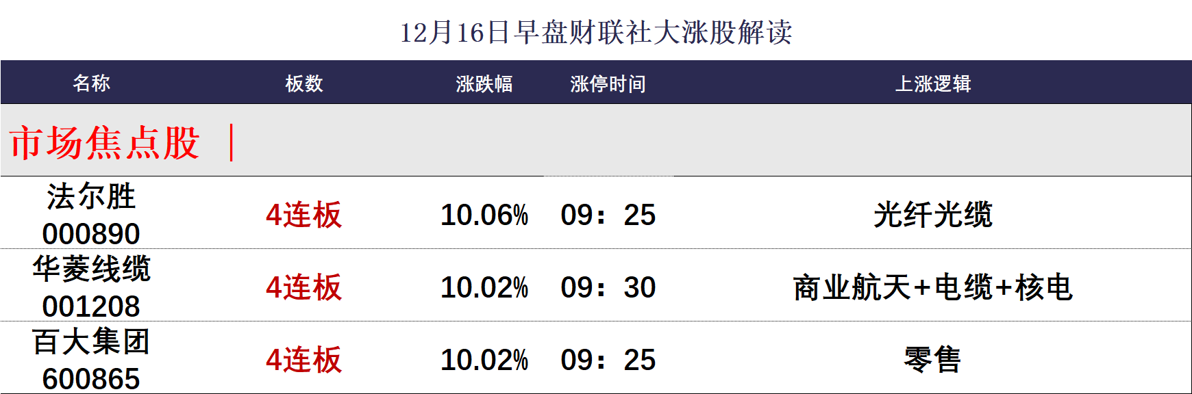 财联社12月16日电,今日午盘全市场共30股涨停,连板股总数11只,15股封板未遂,封板率为67%(不含ST股、退市股)。焦点股方面,光纤光缆概念股法尔胜4连板,零售板块百大集团4连板,商业航天概念股华菱线缆4连板。