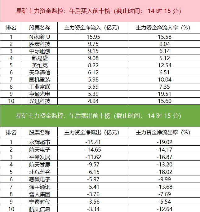 财联社12月17日电,财联社星矿数据显示,今日主力资金净流入通信、有色金属、能源金属等板块,净流出国防军工、交运设备、计算机等板块,其中国防军工板块净流出超51亿元。个股方面,N沐曦-U资金净买入15.95亿元位居首位,胜宏科技、中际旭创、新易盛主力资金净流入居前;永辉超市遭净卖出超15亿元位居首位,航天电子、平潭发展、航天发展主力资金净流出额居前。