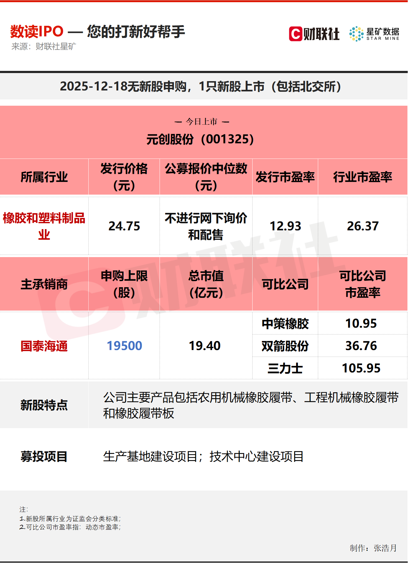 财联社12月18日电,今日无新股申购;有1只新股上市,为深交所的元创股份。元创股份是国内主要的橡胶履带供应商。