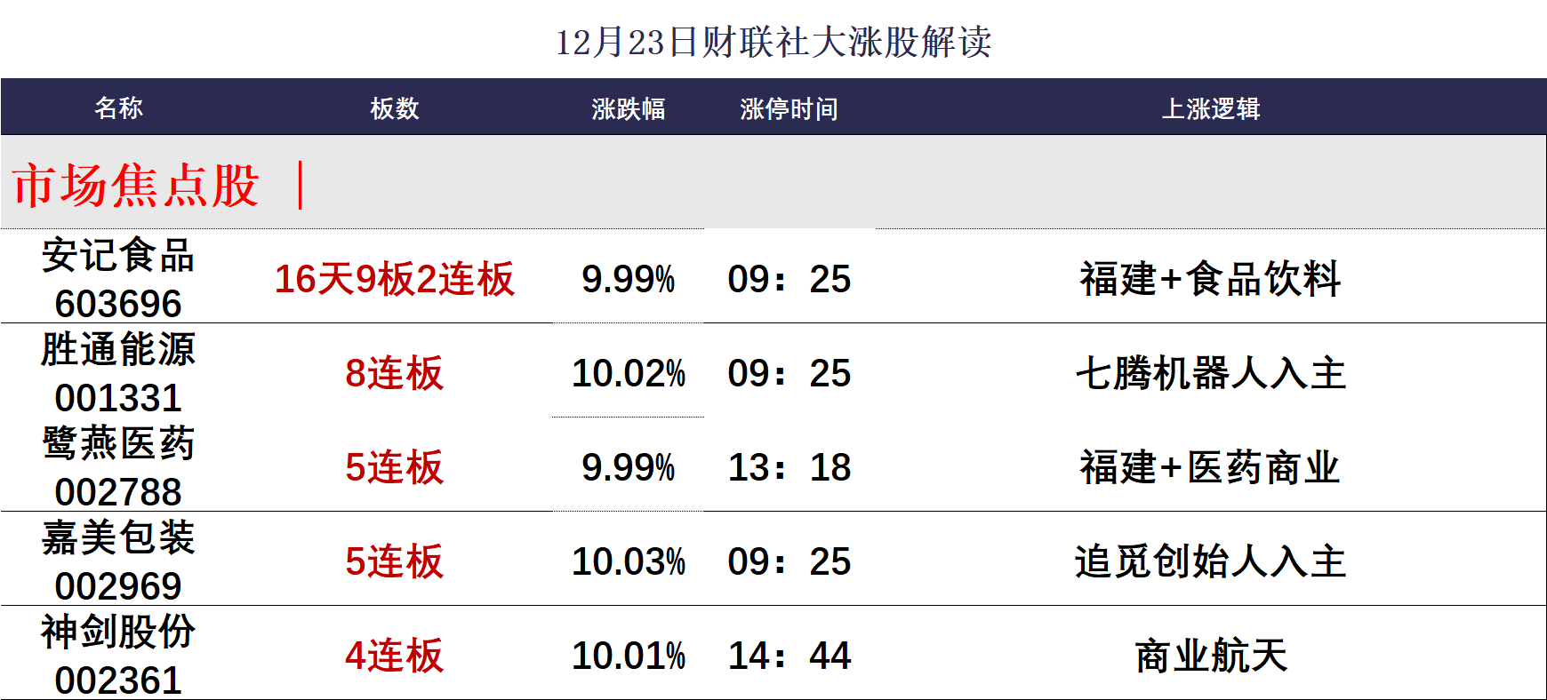 财联社12月23日电,今日全市场共54股涨停,连板股总数17只,21股封板未遂,封板率为72%(不含ST股、退市股)。焦点股方面,福建本地股安记食品16天9板、鹭燕医药5连板,实控人变更的胜通能源8连板、嘉美包装5连板,商业航天概念股神剑股份4连板。