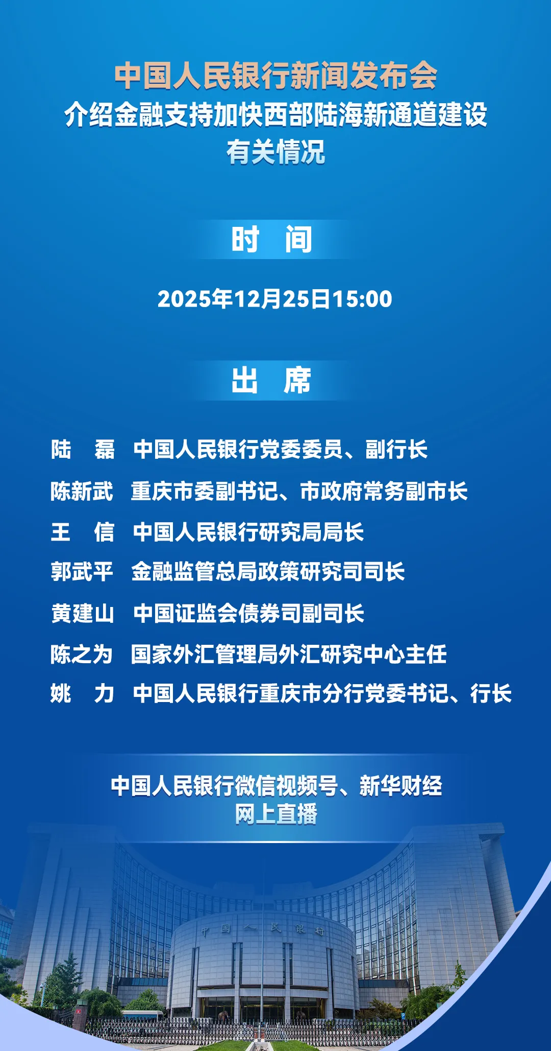 财联社12月25日电,中国人民银行将于12月25日下午15时举行新闻发布会,介绍金融支持加快西部陆海新通道建设有关情况。央行副行长陆磊等负责人将出席。