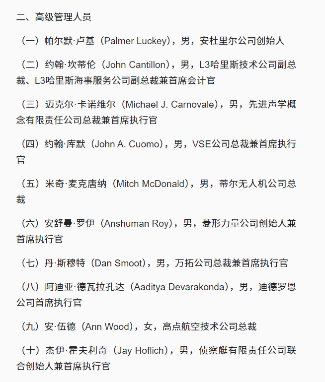 二、对帕尔默·卢基(安杜里尔公司创始人)、约翰·坎蒂伦(L3哈里斯技术公司副总裁、L3哈里斯海事服务公司副总裁兼首席会计官)、迈克尔·卡诺维尔(先进声学概念有限责任公司总裁兼首席执行官)、约翰·库默(VSE公司总裁兼首席执行官)、米奇·麦克唐纳(蒂尔无人机公司总裁)、安舒曼·罗伊(菱形力量公司创始人兼首席执行官)、丹·斯穆特(万拓公司总裁兼首席执行官)、阿迪亚·德瓦拉孔达(迪德罗恩公司首席执行官)、安·伍德(高点航空技术公司总裁)、杰伊·霍夫利奇(侦察艇有限责任公司联合创始人兼首席执行官)等10名后附《反制清单》列明的企业高级管理人员,冻结在我国境内的动产、不动产和其他各类财产;禁止我国境内的组织、个人与其本人进行有关交易、合作等活动;对其本人不予签发签证、不准入境(包括香港、澳门)。