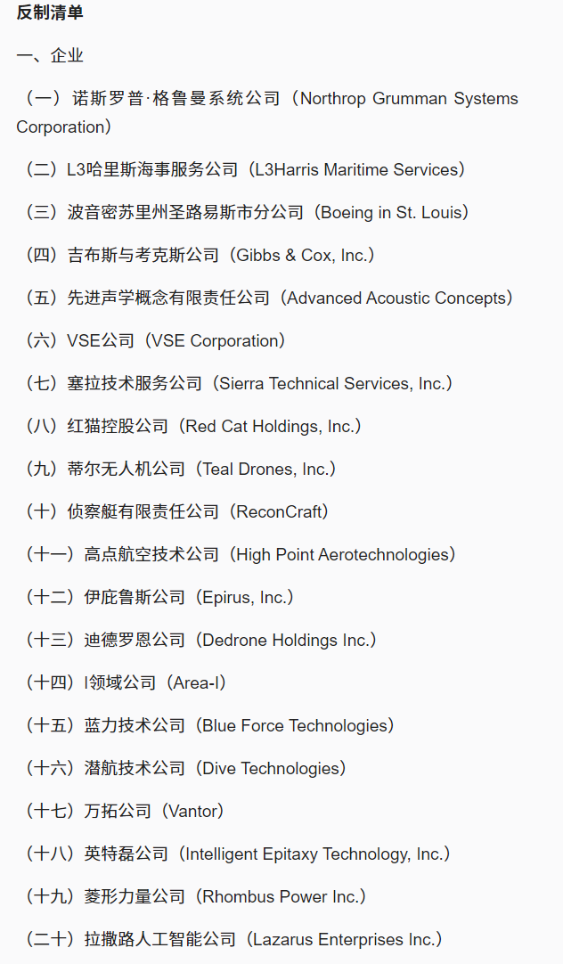 一、对诺斯罗普·格鲁曼系统公司、L3哈里斯海事服务公司、波音密苏里州圣路易斯市分公司、吉布斯与考克斯公司、先进声学概念有限责任公司、VSE公司、塞拉技术服务公司、红猫控股公司、蒂尔无人机公司、侦察艇有限责任公司、高点航空技术公司、伊庇鲁斯公司、迪德罗恩公司、I领域公司、蓝力技术公司、潜航技术公司、万拓公司、英特磊公司、菱形力量公司、拉撒路人工智能公司等20家后附《反制清单》列明的企业,冻结在我国境内的动产、不动产和其他各类财产;禁止我国境内的组织、个人与其进行有关交易、合作等活动。