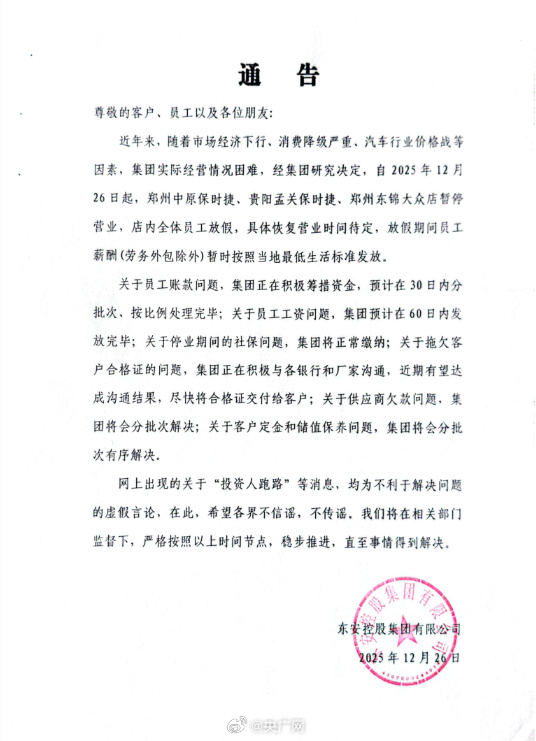 财联社12月26日电,东安控股集团有限公司旗下的“郑州中原保时捷中心疑闭店‘跑路’”一事引发热议。东安控股集团有限公司12月26日发布相关通报称,集团实际经营情况困难,经集团研究决定,自2025年12月26日起,郑州中原保时捷、贵阳孟关保时捷、郑州东锦大众店暂停营业,店内全体员工放假,具体恢复营业时间待定,放假期间员工薪酬(劳务外包除外)暂时按照当地最低生活标准发放。关于客户定金和储值保养问题,集团将会分批次有序解决。 (央广网)
