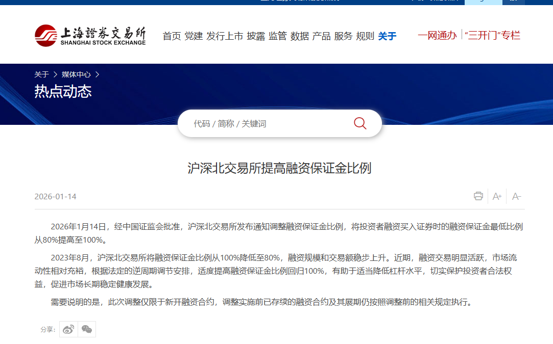 2026年1月14日,经中国证监会批准,沪深北交易所发布通知调整融资保证金比例,将投资者融资买入证券时的融资保证金最低比例从80%提高至100%。