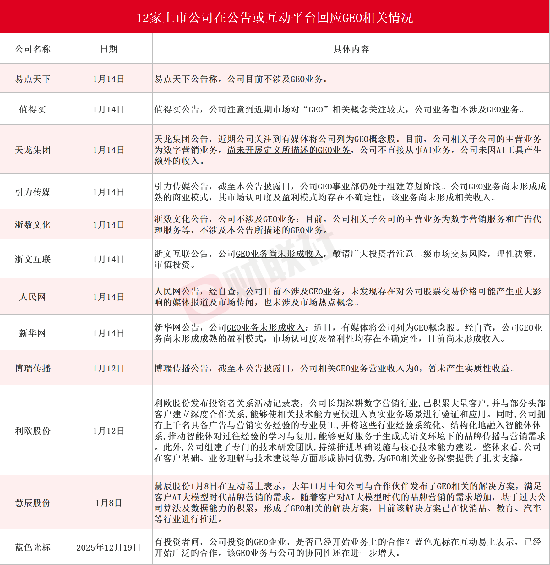 财联社1月14日电,近日,马斯克在社交媒体平台X发文称,将在一周内正式开源X平台最新的内容推荐算法,此举被业内解读为“马斯克也要涉足GEO”。A股方面,截至收盘,探索GEO相关业务的利欧股份斩获9天6板,整合营销平台的省广集团实现4连板,拥有新媒体营销业务的天下秀录得4天3板,拥有GEO业务的浙文互联实现4天3板。据财联社不完全整理,易点天下、值得买、天龙集团、引力传媒、浙数文化、浙文互联、人民网、新华网、博瑞传播、利欧股份、慧辰股份和蓝色光标在内的12家A股上市公司在公告或互动平台披露GEO相关情况。引力传媒今日公告,截至本公告披露日,公司GEO事业部仍处于组建筹划阶段。公司GEO业务尚未形成成熟的商业模式,其市场认可度及盈利模式均存在不确定性,该业务尚未形成相关收入。