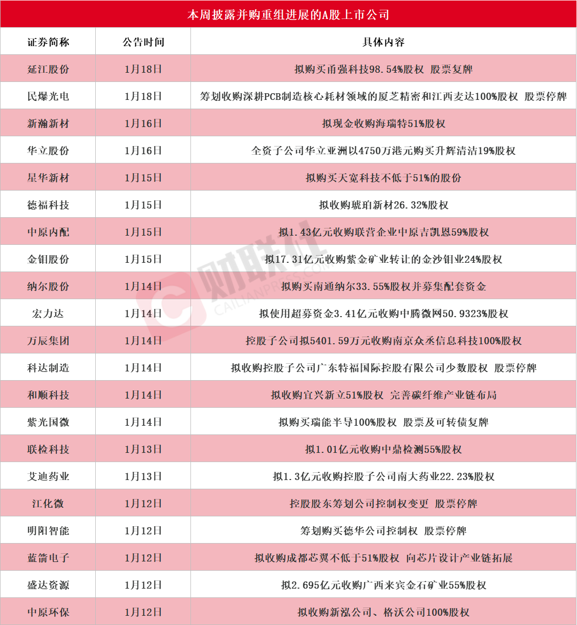 财联社1月18日电,据财联社不完全统计,截至发稿,本周(1月12日-1月18日)包括延江股份、民爆光电、新瀚新材、华立股份、星华新材、德福科技、中原内配、金钼股份、纳尔股份、宏力达、万辰集团、科达制造、和顺科技、紫光国微、联检科技、艾迪药业、江化微、明阳智能、蓝箭电子、盛达资源、中原环保在内的21家A股上市公司披露并购重组进展最新公告。其中,延江股份公告称,拟通过发行股份及支付现金的方式购买甬强科技98.54%的股权,同时向厦门延盛、谢继华发行股份募集配套资金,股票复牌。