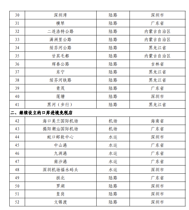 财联社1月21日电,财政部发布关于口岸进境免税店有关事宜的通知,在武汉天河国际机场等41个口岸各新设1家口岸进境免税店(在本通知所附《设立口岸进境免税店名单》中为序号1—41)。其中,横琴口岸进境免税店设立后,允许自澳门进境居民旅客在该口岸进境免税店购买一定数量(15000元以内)的免税商品。 继续在海口美兰国际机场、蛇口邮轮中心等11个口岸设立口岸进境免税店(在本通知所附《设立口岸进境免税店名单》中为序号42—52)。 停止设立青岛流亭国际机场、广州东火车站、江门港等3个口岸进境免税店。待厦门高崎国际机场客运航线转场至厦门翔安国际机场后,停止设立厦门高崎国际机场口岸进境免税店。