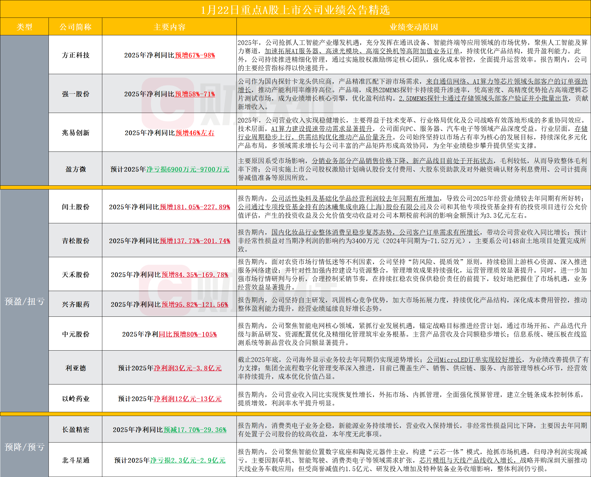 财联社1月22日电,据财联社不完全统计,截至发稿,盘后包括方正科技、强一股份、兆易创新、盈方微、闰土股份、青松股份、天禾股份、兴齐眼药、中元股份、利亚德、以岭药业、长盈精密、北斗星通等多家A股上市公司发布2025年业绩预告。其中,兆易创新公告,2025年净利同比预增46%左右,存储行业周期稳步上行,供需结构优化推动产品价量齐升。3连板盈方微公告,预计2025年净亏损6900万元-9700万元。
