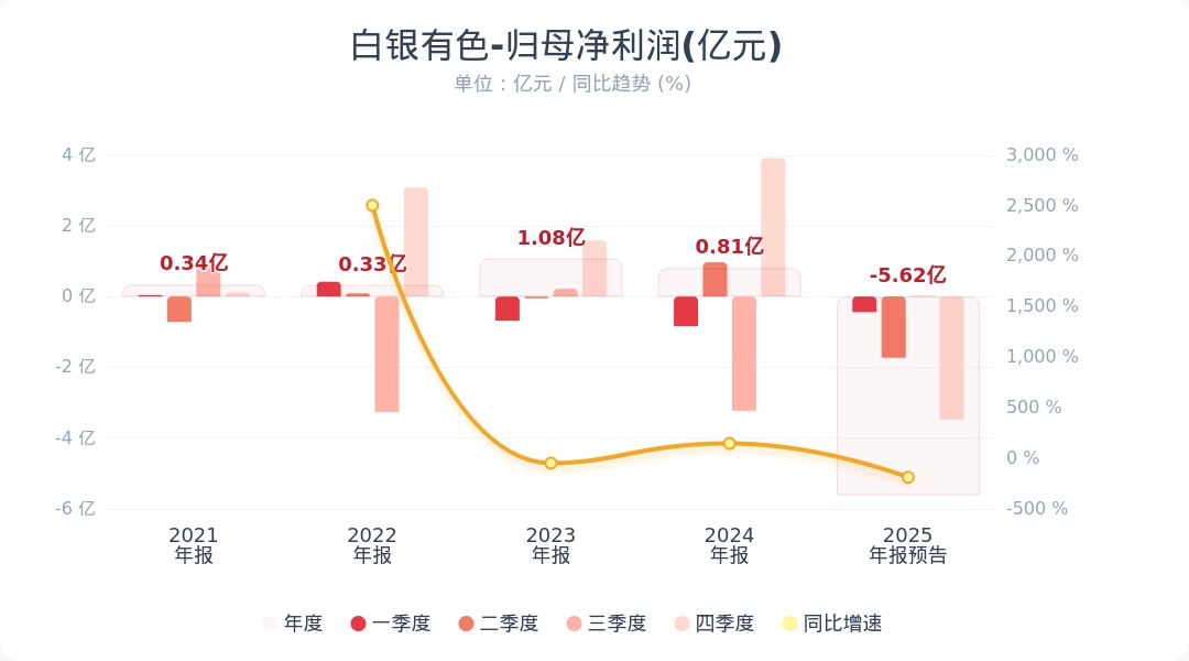 财联社1月23日电,白银有色(601212.SH)公告称,预计2025年年度归属于上市公司股东的净利润为-4.50亿元到-6.75亿元。2025年有色金属及贵金属产品市场价格同比上升,公司主要产品产量同比增加,并强化内部管理,多措并举降本增效、开源节流,毛利率同比上升。但是由于公司下属子公司上海红鹭国际贸易有限公司与南储仓储管理集团有限公司及其上海分公司的仓储合同纠纷案,2025年上半年基于该案件的最新进展及谨慎性原则,计提预计负债金额约3.14亿元。另外,由于市场价格波动导致当期点价交易形成的嵌入式衍生金融工具公允价值变动损失同比增加,相应影响了公司业绩。小财注:Q3净利润224.1万元,据此计算,Q4预计净亏损2.35亿元-4.6亿元。