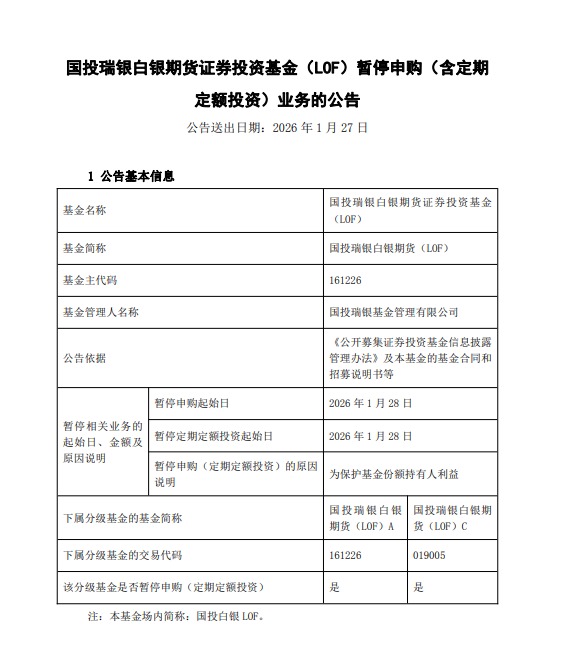 财联社1月26日电,国投白银LOF公告,将于1月28日起暂停申购(含定期定额投资)业务。