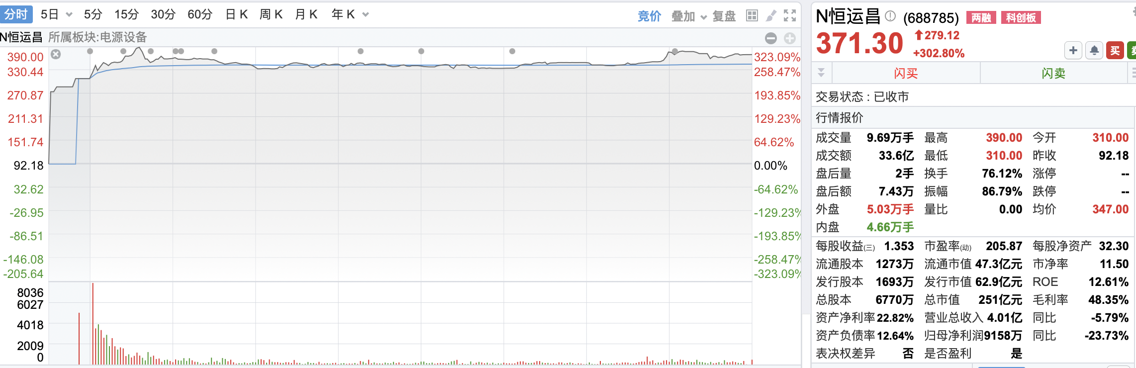 其上市首日(1月28日)开盘价为310元/股,盘中涨幅一度达到323%至390元/股,最终报收371.3元/股,涨幅达302.8%,收盘总市值251亿元。其亦成为2026年以来首家上市的科创板企业。