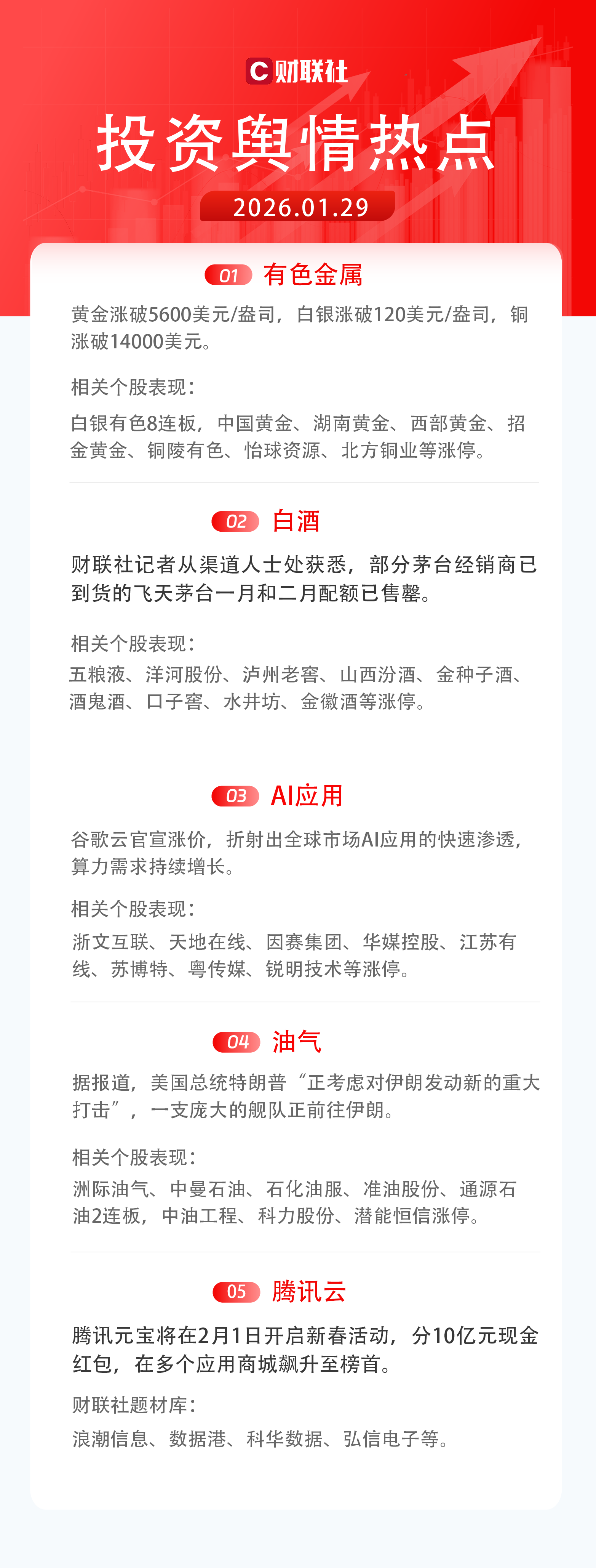 1)有色金属:黄金涨破5600美元/盎司,白银涨破120美元/盎司,铜涨破14000美元。