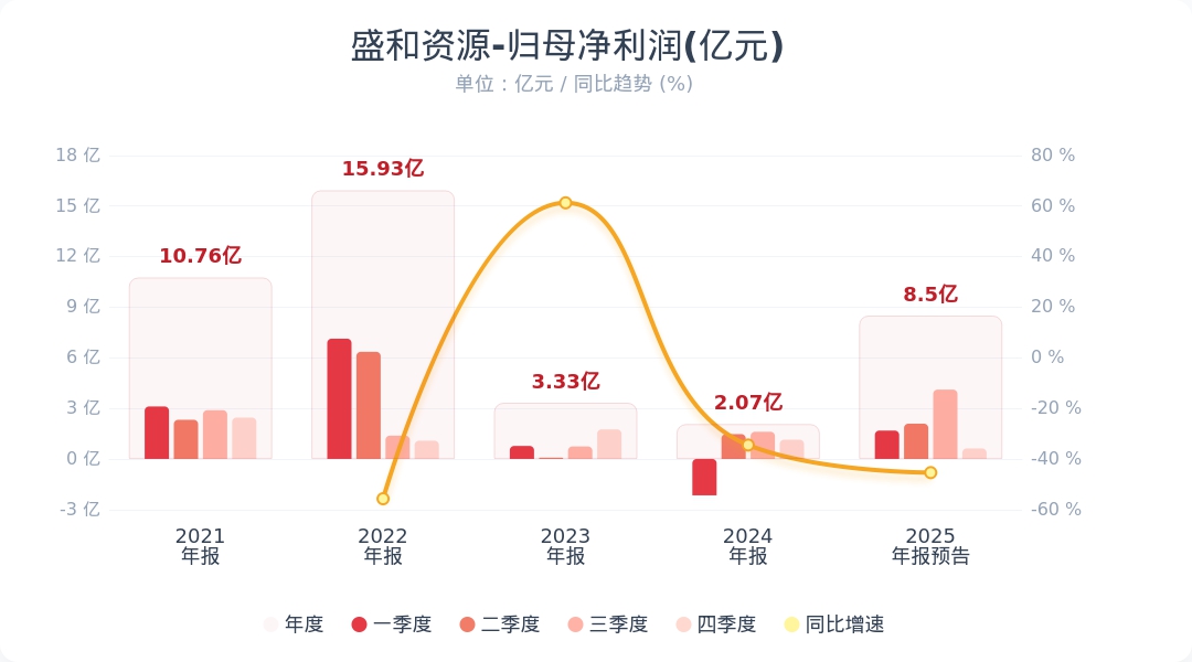财联社1月29日电,盛和资源(600392.SH)公告称,盛和资源预计2025年度归属于上市公司股东的净利润为7.90亿元至9.10亿元,同比增加281.28%到339.20%。报告期内,稀土市场行情整体上涨,主要产品价格全年销售均价大幅上升,公司优化产销结构、加强成本管控,主要产品销量同比增长,驱动业绩大幅增长。小财注:Q3净利润4.11亿元,据此计算,Q4净利润预计239.9万元-1.22亿元,环比下降70%-99%。第四季度净利润分析师一致预测为1.07亿元。