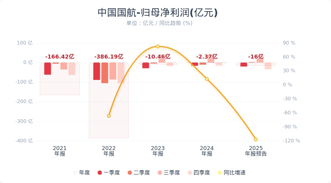 财联社1月30日电,中国国航(601111.SH)公告称,预计2025年度归属于上市公司股东的净亏损约为13亿元到19亿元。上年同期归属于上市公司股东的净亏损为2.37亿元。2025年,公司全力以赴促生产、强经营、稳增长,经营效益整体呈现增投增收降本特点,巩固了经营质量持续向优态势。公司严格执行企业会计准则,于资产负债表日对递延所得税资产的账面价值进行复核,相应转回部分递延所得税资产,预计2025年归属于上市公司股东净利润出现亏损。小财注:Q3净利润36.76亿元,据此计算,Q4预计净亏损31.7亿元-37.7亿元。第四季度净利润分析师一致预测为-4.74亿,业绩低于预期。