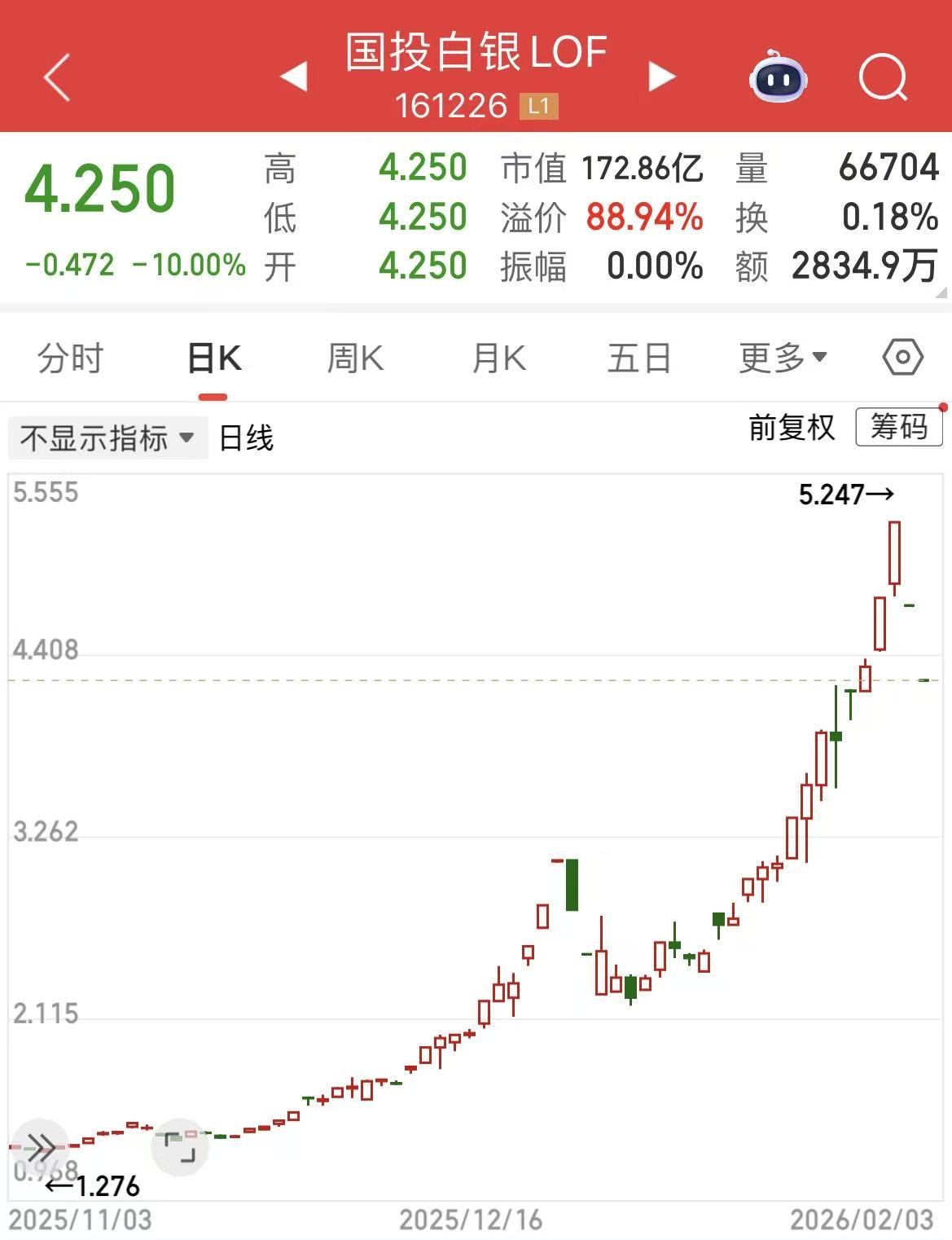 财联社2月3日电,国投白银LOF今日复牌再度跌停,报4.25元,最新溢价率为88.94%。国投白银LOF2日发布公告称,决定参考白银期货国际主要市场的价格变动幅度,对基金资产进行合理重估;国投瑞银白银LOF2日晚间更新净值后显示,单日净值跌幅达31.5%,创公募基金单日下跌历史纪录。