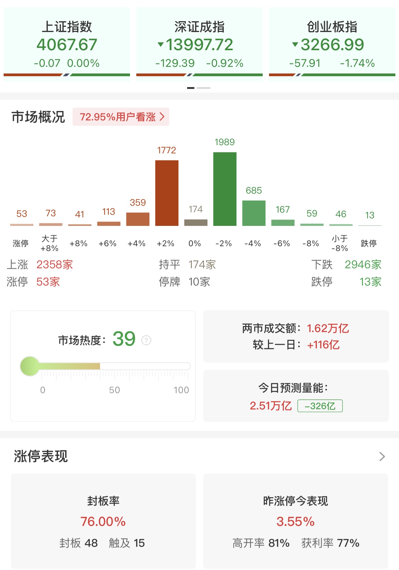 财联社2月4日电,市场早盘震荡回落,沪指翻绿,创业板指盘中跌超2%。沪深两市半日成交额1.62万亿,较上个交易日放量116亿。盘面上热点快速轮动,全市场超2900只个股下跌。从板块来看,太空光伏概念爆发,中来股份20cm涨停,国晟科技2连板。煤炭概念集体反弹,兖矿能源、中煤能源、陕西黑猫涨停。机场航运概念走强,中国东航、华夏航空涨停。房地产板块表现活跃,荣安地产、财信发展涨停。氢能源概念快速拉升,京城股份、致远新能涨停。下跌方面,贵金属概念高开低走,招金黄金、四川黄金大跌。AI应用概念集体下挫,引力传媒跌停。截至收盘,深成指跌0.92%,创业板指跌1.74%。