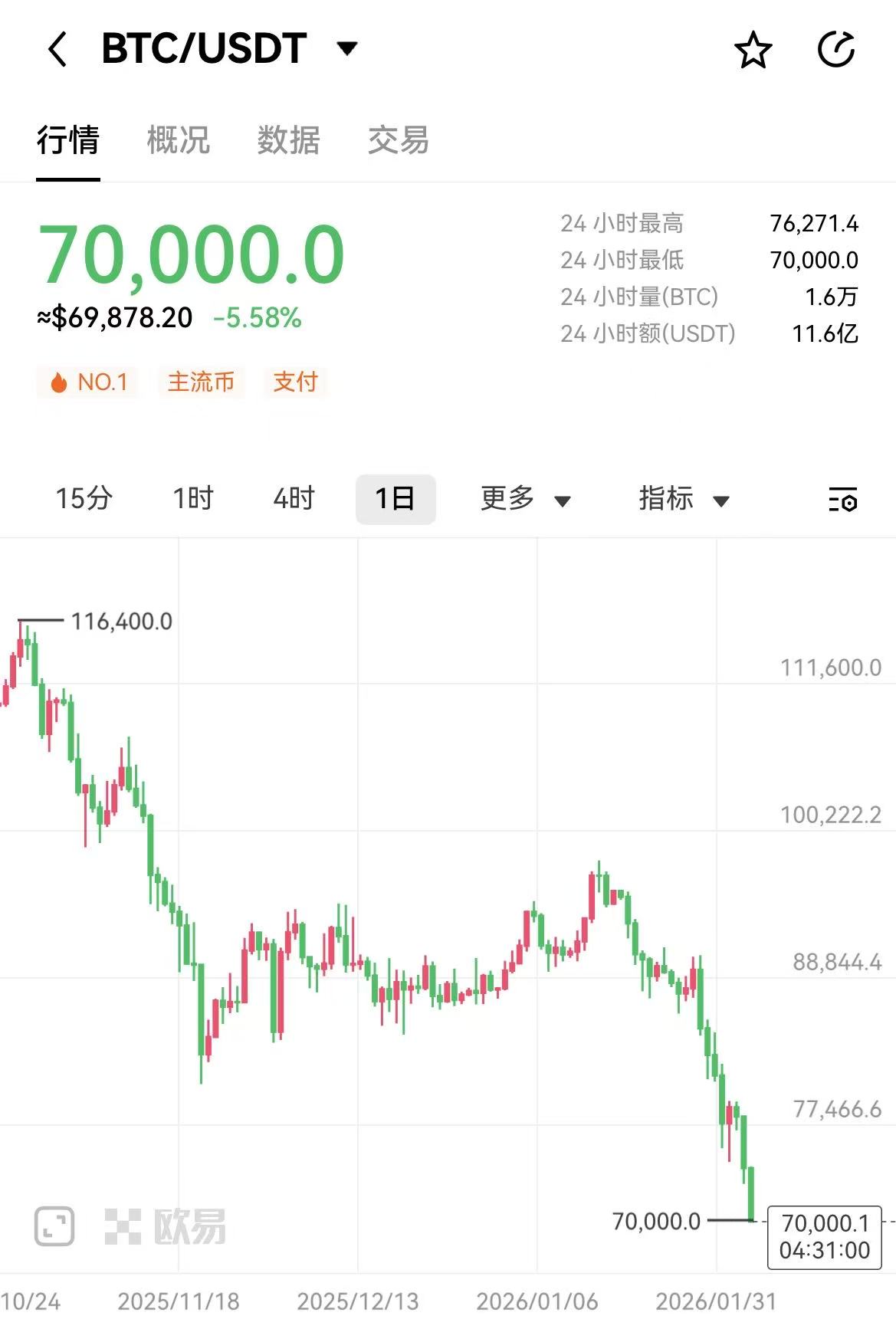 财联社2月5日电,比特币自2024年11月6日以来首次跌破70,000美元关口。