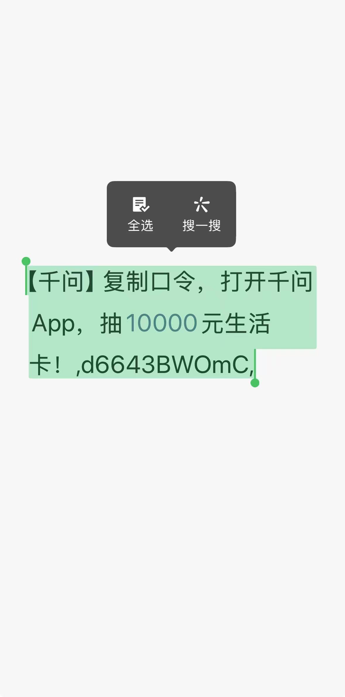 《科创板日报》6日讯,多名用户向《科创板日报》记者反馈,目前千问的春节活动口令无法在微信进行复制传播,选中千问的活动口令后,微信页面没有复制键。对此,微信未做回应。(黄心怡 李佳怡)