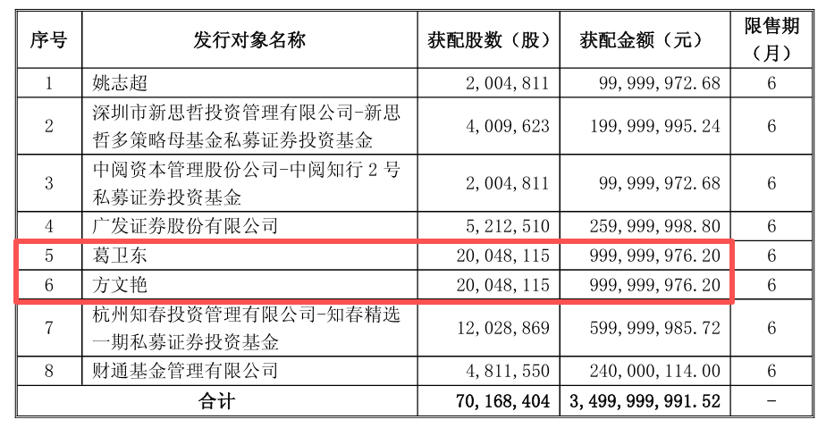 财联社2月10日电,江淮汽车(600418.SH)披露定增发行情况报告书,公司向姚志超、葛卫东等8名投资者合计发行了7016.84万股股份,发行价格为49.88元/股,募集资金总额为约35亿元。其中,私募大佬葛卫东耗资约10亿元认购了2004.81万股。同时,方文艳也出资10亿元认购了2004.81万股股份。本次向特定对象发行股票完成后,发行对象所认购的股份自发行结束之日起六个月内不得转让。
