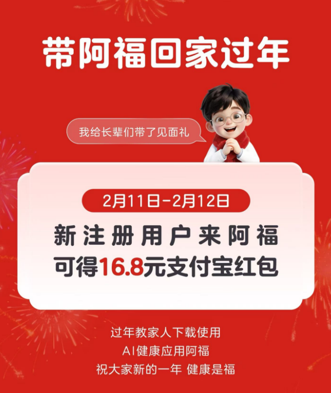 《科创板日报》11日讯,《科创板日报》获悉,蚂蚁阿福开启支付宝红包活动 ,2月11日-2月12日新注册用户在阿福可得16.8元支付宝红包。(记者 黄心怡)