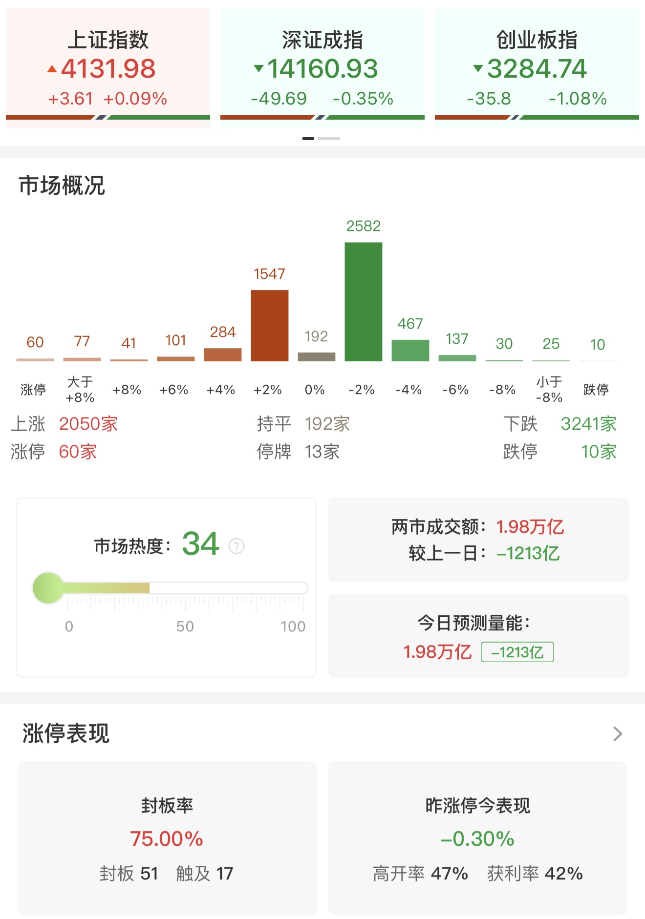 财联社2月11日电,三大指数涨跌不一,创业板指、科创50指数跌超1%。时隔31个交易日,沪深两市成交额跌破2万亿,较上一个交易日缩量1213亿。盘面上,全市场超3200只个股下跌。从板块来看,化工板块近期反复走强,吉华集团5天4板,泰和新材、百川股份、醋化股份、华尔泰涨停。玻纤概念快速拉升,宏和科技、山东玻纤、国际复材、中国巨石涨停。有色金属板块表现活跃,有色·钨概念领涨,翔鹭钨业4天2板,章源钨业涨停。算力租赁概念拉升,南兴股份、大位科技涨停。下跌方面,影视院线概念集体下挫,横店影视跌停,华谊兄弟、华策影视、中国电影大跌。截至收盘,沪指涨0.09%,深成指跌0.35%,创业板指跌1.08%。