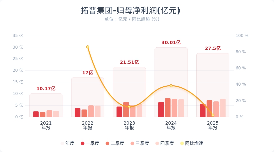 财联社2月11日电,拓普集团(601689.SH)公告称,预计2025年度营业收入为287.50亿元至303.50亿元,同比增加8.08%至14.10%。预计实现归属于上市公司股东的净利润为26.00亿元至29.00亿元,同比下降3.35%至13.35%。预计实现归属于上市公司股东的扣除非经常性损益的净利润为24.20亿元至27.20亿元,同比下降0.30%至11.30%。本期利润增长未达预期的主要原因为:一方面,原材料价格波动与市场竞争加剧导致毛利率下降,叠加国际局势复杂多变进一步增加经营不确定性;另一方面,海外新建产能尚处于爬坡阶段,折旧摊销等固定成本较高,多重因素共同作用下,公司利润未能实现预期增长。小财注:2025年Q3净利6.72亿元,据此计算,2025年Q4净利润预计6.33亿元-9.33亿元,环比变动为-5%至38%。第四季度净利润分析师一致预测是9.70亿。