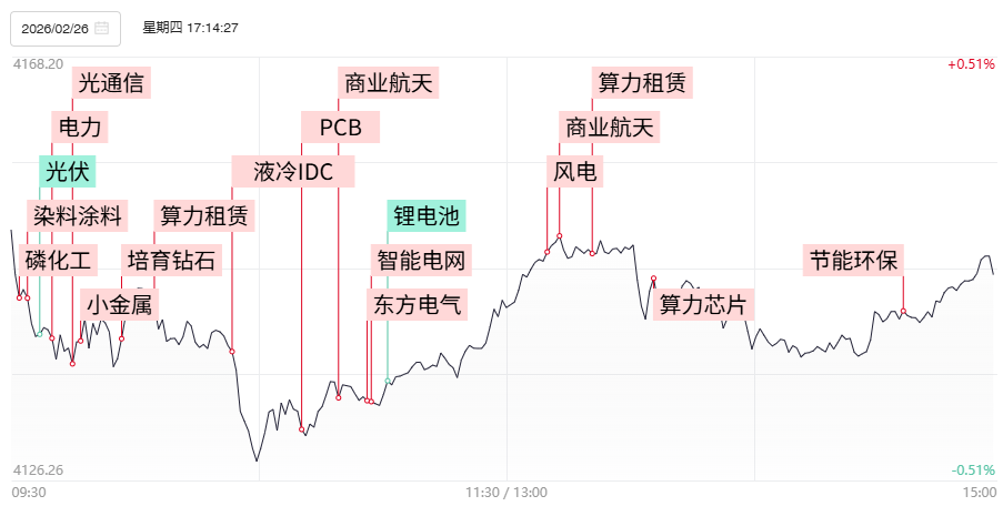 财联社2月27日电,上个交易日市场探底回升,三大指数涨跌不一,创业板指盘中一度跌超1%,黄白线分化,全市场超2800只个股下跌。沪深两市成交额2.54万亿,较上一个交易日放量759亿。1)美东时间周三盘后,英伟达公布了其2025财年第四季度财报。该季度其总营收为681.3亿美元,较上一季度增长22%,较去年同期增长75%。对于Rubin,本周早些时候,英伟达已向客户交付首批 Vera Rubin 样品,量产计划将于2026年下半年如期推进。受上述消息提振,Vera Rubin相关算力硬件细分集体爆发。2)OpenRouter最新周度数据显示,平台前十模型总token量中,中国模型占比超60%,前三甲均为国产大模型。随着字节跳动旗下豆包接连发布视频生成模型Seedance2.0和系列Agent模型的火爆,字节为首的国产算力概念结束连续两日调整卷土重来,算力租赁概念龙头润泽科技触及20厘米涨停并创出历史新高,进而带动算力芯片、半导体设备方向也集体走强。3)近期商业航天产业链再度迎来密集催化,中科宇航可回收液体火箭力箭二号计划今年3月下旬首飞。此前蓝箭航天宣布,我国重复使用火箭朱雀三号计划今年第二季度再次开展回收试验。商业航天概念近期热度重燃,春晖智控、航天动力封涨停,电科蓝天、广联航空、信科移动等纷纷位居涨幅前列。4)2026年全国两会即将召开,多部法律草案将提请审议,其中包括生态环境法典草案。该法典作为中国第二部以“法典”命名的法律,涵盖污染防治、生态保护、绿色低碳发展等方面。环保板块受此消息刺激,午后应声大涨。