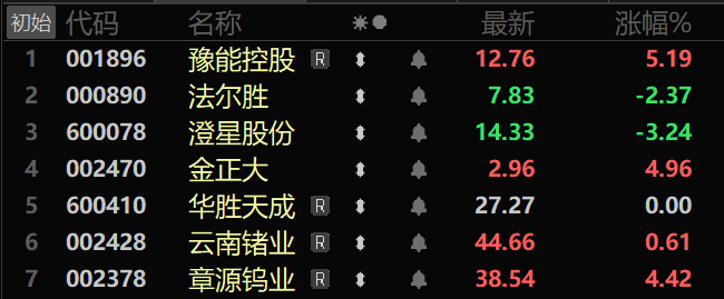 财联社2月27日电,市场焦点股豫能控股(6板)高开5.19%,光纤光缆概念股法尔胜(4板)低开2.37%,化工板块澄星股份(3板)低开3.24%、金正大(3板)高开4.96%,算力工程概念股华胜天成(4天2板)平开,有色金属板块云南锗业(2板)高开0.61%、章源钨业(6天4板)高开4.42%。