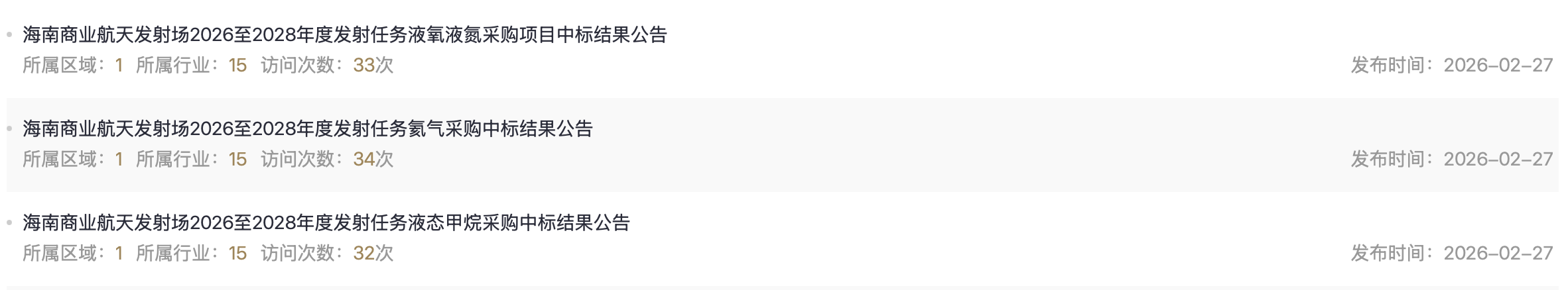 财联社2月27日电,今日(27日),海南商业航天发射场火箭发射使用燃料采购中标结果正式出炉,九丰特种气体成为最大赢家,在液氧液氮、液态甲烷、氦气领域合计中标约1.45亿元。另外,广钢气体在氦气采购项目中有所斩获。具体而言,根据《海南商业航天发射场2026至2028年度发射任务液氧液氮采购项目中标结果公告》,海南九丰特种气体有限公司中标标段1采购项目,中标价9265.15万元;海南锋利气体有限公司中标标段2采购项目,中标价2498.46万元。根据《海南商业航天发射场2026至2028年度发射任务氦气采购中标结果公告》,广钢气体(广州)有限公司中标标段1项目,中标金额3267万元;广东九丰特种气体有限公司中标标段2采购项目,中标金额848万元。根据《海南商业航天发射场2026至2028年度发射任务液态甲烷采购中标结果公告》,海南九丰特种气体有限公司为中标人,中标金额4429.75万元。