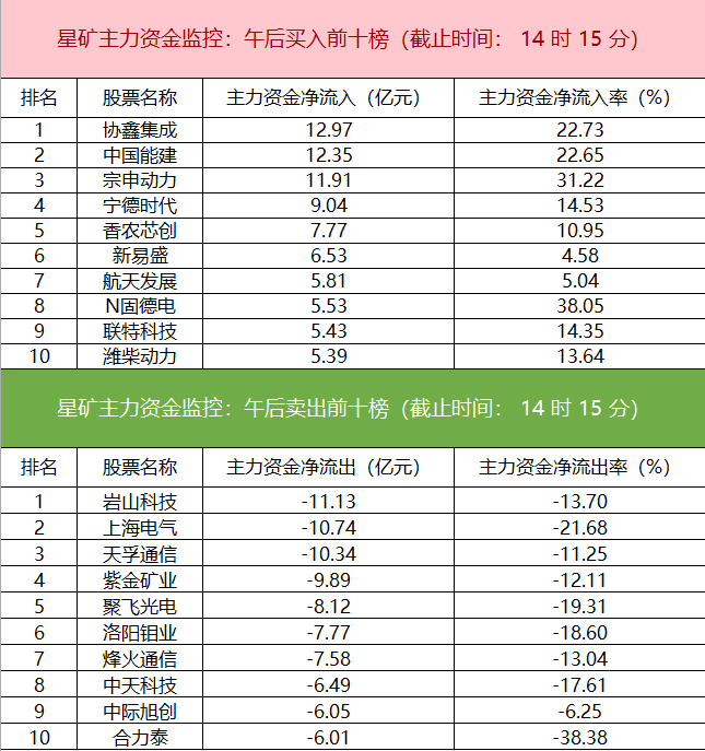 财联社3月6日电,财联社星矿数据显示,今日主力资金净流入基础化工、电新行业、电力设备等板块,净流出电子、有色金属、光学光电子等板块,其中电子板块净流出超60亿元。个股方面,协鑫集成资金净买入12.97亿元位居首位,中国能建、宗申动力、宁德时代主力资金净流入居前;岩山科技遭净卖出超11亿元位居首位,上海电气、天孚通信、紫金矿业主力资金净流出额居前。