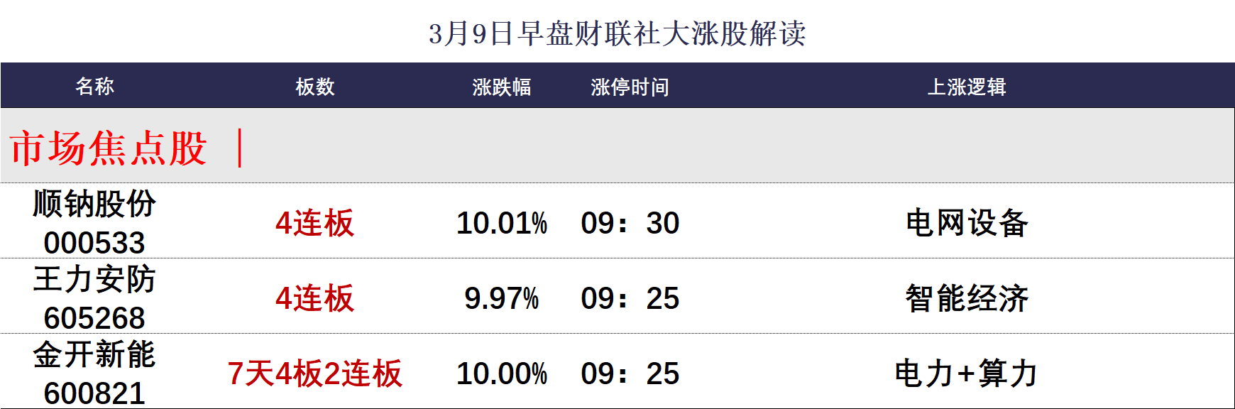 财联社3月9日电,今日午盘全市场共34股涨停,连板股总数8只,29股封板未遂,封板率为54%(不含ST股、退市股)。焦点股方面,电网设备板块顺钠股份4连板,智能经济概念股王力安防4连板,电力股金开新能走出7天4板。