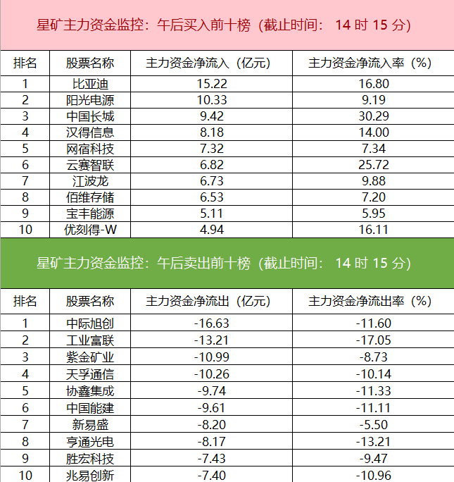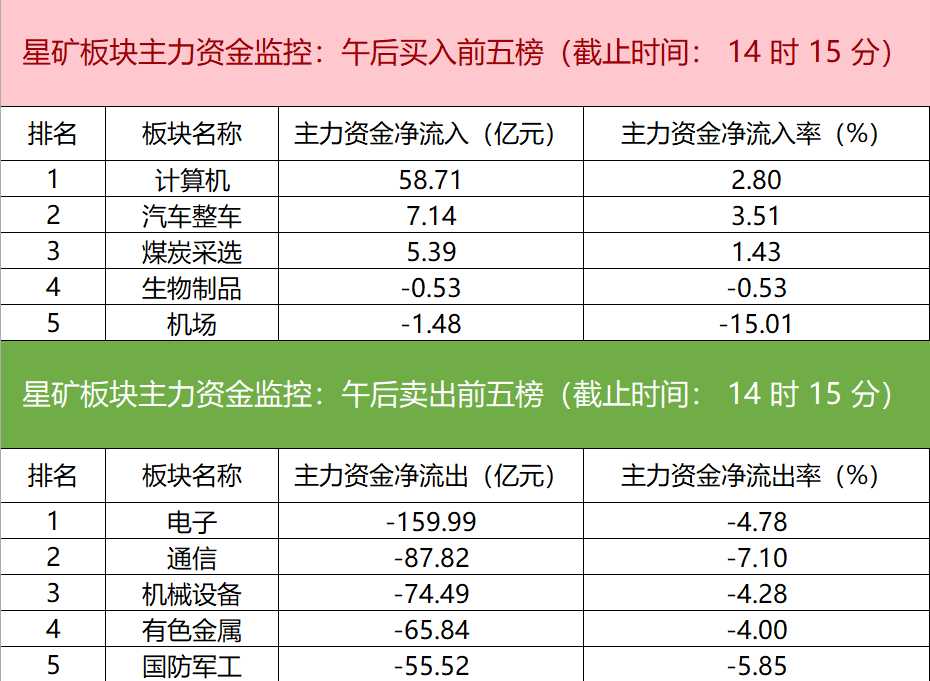 财联社3月9日电,财联社星矿数据显示,今日主力资金净流入计算机、汽车整车、煤炭采选等板块,净流出电子、通信、机械设备等板块,其中电子板块净流出超159亿元。个股方面,比亚迪资金净买入15.22亿元位居首位,阳光电源、中国长城、汉得信息主力资金净流入居前;中际旭创遭净卖出超16亿元位居首位,工业富联、紫金矿业、天孚通信主力资金净流出额居前。