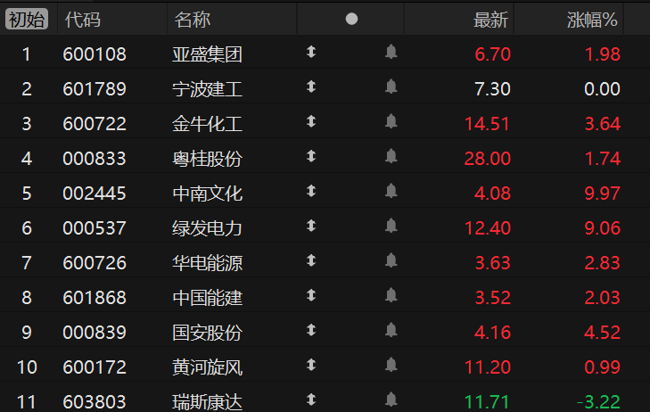 财联社3月12日电,市场焦点股亚盛集团(9天7板)高开1.98%,数据中心机柜出租的宁波建工(4板)平开,化工板块金牛化工(8天4板)高开3.64%、粤桂股份(4天2板)高开1.74%,并购重组的中南文化(3板)竞价涨停,算电协同概念股绿发电力(2板)高开9.06%、华电能源(2板)高开2.83%、中国能建(4天2板)高开2.03%,网络安全板块国安股份(2板)高开4.52%,金刚石散热概念股黄河旋风(2板)高开0.99%,光通信板块瑞斯康达(2板)低开3.22%。