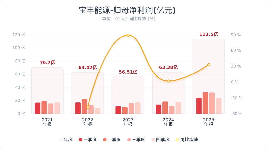 财联社3月12日电,宝丰能源(600989.SH)发布2025年年度报告,2025年实现营业收入480.38亿元,同比增长45.64%;归属于上市公司股东的净利润113.5亿元,同比增长79.09%。基本每股收益1.56元。公司2025年末期利润分配方案为:以公司总股本73.33亿股扣除回购股份6059.34万股后72.73亿股为基数,拟派发现金红利30.55亿元。其中中小股东每股派发现金红利0.4921元(含税),大股东每股派发现金红利0.3906元(含税)。报告期内,内蒙古基地全球单厂规模最大的300万吨/年煤制烯烃项目全面达产,公司烯烃产能达到520万吨/年,产能规模跃居我国煤制烯烃行业第一位。小财注:宝丰能源2025年Q3净利润32.32亿,据此计算,Q4净利润24亿,环比下降25%。第四季度净利润分析师一致预测是30.77亿,业绩低于预期。
