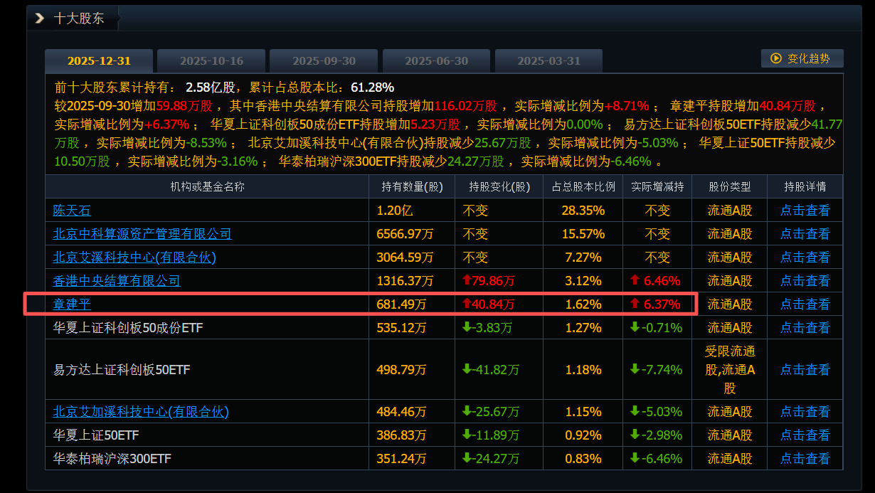 《科创板日报》12日讯,寒武纪(688256.SH)发布2025年年度报告显示,与三季报相比,第五大股东章建平持仓增加40.84万股至681.49万股,占总股本比例1.62%。按今日收盘价1099元/股计算,章建平持仓市值近75亿元。