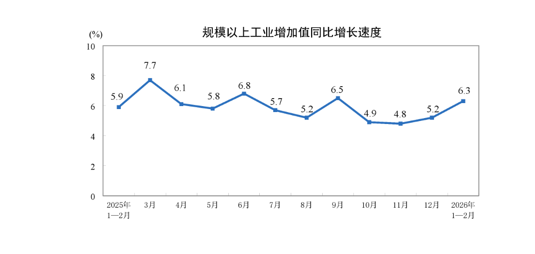 国家统计局:1—2月份规模以上工业增加值同比实际增长6.3%