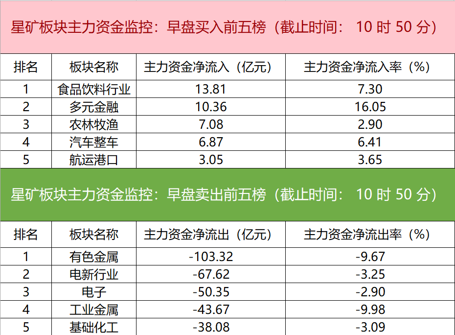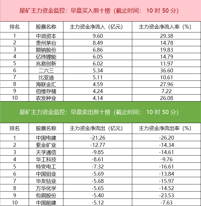 财联社3月16日电,财联社星矿数据显示,今日早盘主力资金净流入食品饮料行业、多元金融、农林牧渔等板块,净流出有色金属、电新行业、电子等板块,其中有色金属板块净流出超103亿元。个股方面,中油资本涨停,主力资金净买入超9.60亿元位居首位,贵州茅台、顺钠股份、亿纬锂能获主力资金净流入居前;中国电建遭净卖出超21亿元,紫金矿业、天孚通信、华工科技资金净流出额居前。