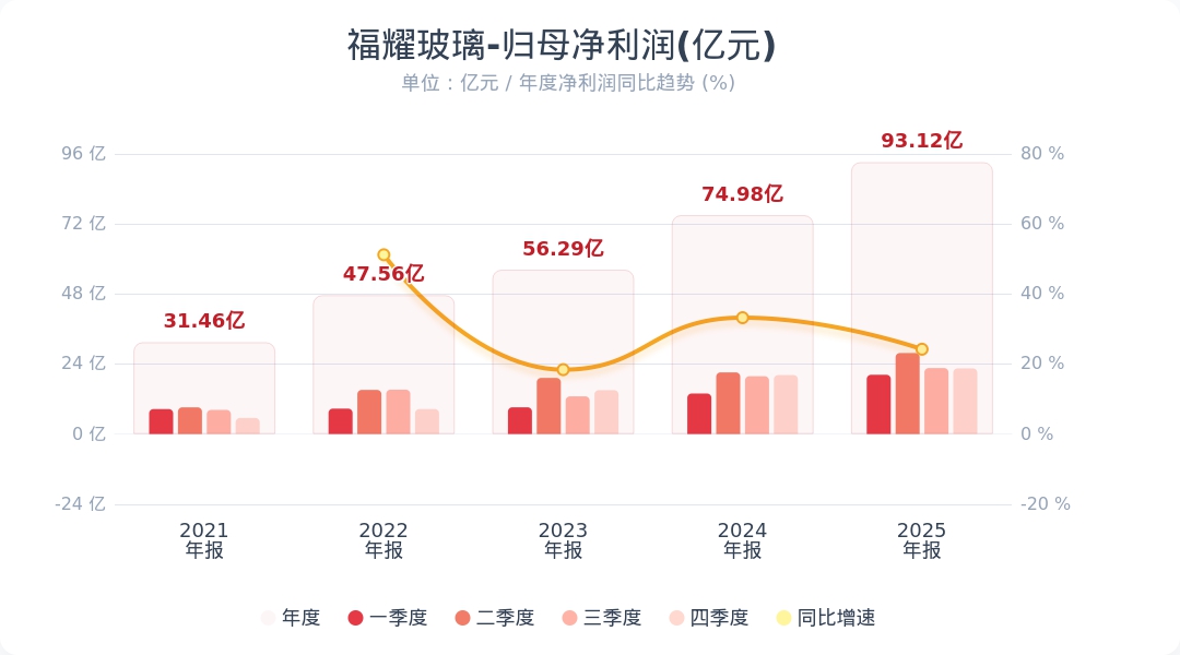 财联社3月17日电,福耀玻璃(600660.SH)披露年度报告,2025年实现营业收入457.87亿元,同比增长16.65%;归母净利润93.12亿元,同比增长24.2%;基本每股收益3.57元。公司拟每股分配现金股利1.2元(含税)。报告期内,公司汽车玻璃销售收入同比上升17.3%。小财注:福耀玻璃2025年Q3净利润22.59亿,据此计算,Q4净利润22.48亿,环比下降0.47%。