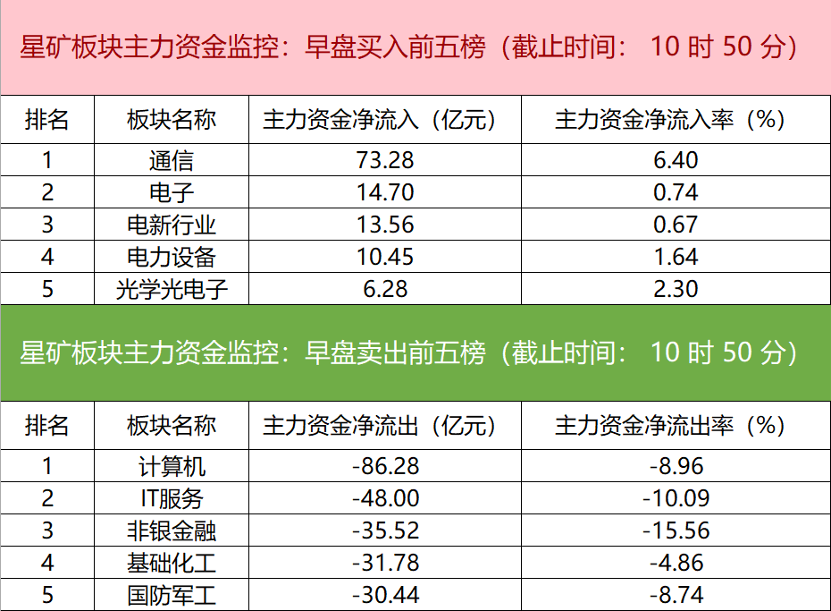 财联社3月20日电,财联社星矿数据显示,今日早盘主力资金净流入通信、电子、电新行业等板块,净流出计算机、IT服务、非银金融等板块,其中计算机板块净流出超86亿元。个股方面,中际旭创大涨,主力资金净买入超23.02亿元位居首位,新易盛、阳光电源、卓胜微获主力资金净流入居前;东方财富遭净卖出超14亿元,航天发展、中油资本、拓维信息资金净流出额居前。