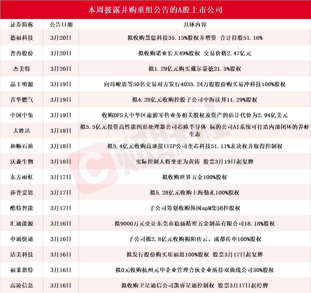 财联社3月22日电,据财联社不完全统计,截至发稿,本周(3月16日-3月22日)包括德福科技、普冉股份、杰美特、晶丰明源、首华燃气、中国中免、大胜达、和顺石油、沃森生物、东方雨虹、莎普爱思、酷特智能、汇通能源、申通快递、洁美科技、福莱蒽特、高凌信息在内的17家A股上市公司披露并购重组进展最新公告。其中,普冉股份拟收购诺亚长天49%股权,交易价格2.47亿元。