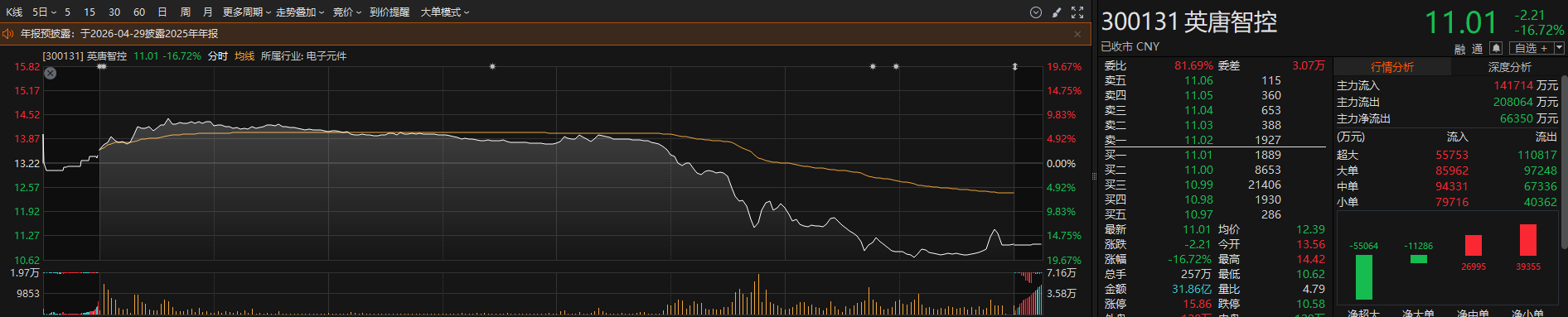 财联社3月25日电,英唐智控(300131.SZ)公告称,公司关注到网络平台出现大量不实信息,现就相关情况澄清:公司拟一次性收购桂林光隆集成科技有限公司100%股权、上海奥简微电子科技有限公司100%股权。公司正按照相关法律法规和交易方案推进收购事宜,待相关工作完成后,公司董事会将择期另行发布召开股东会的通知。公司、控股股东及实控人不存在应披露而未披露的重大事项,生产经营一切正常;2025年度业绩预告已与审计机构预沟通,无分歧;公司、控股股东和实际控制人、董事、高级管理人员近6个月无买卖公司股票行为。小财注:英唐智控今日早盘一度涨近10%,午后跳水盘中跌超19%,收盘报11.01元/股,跌16.72%。