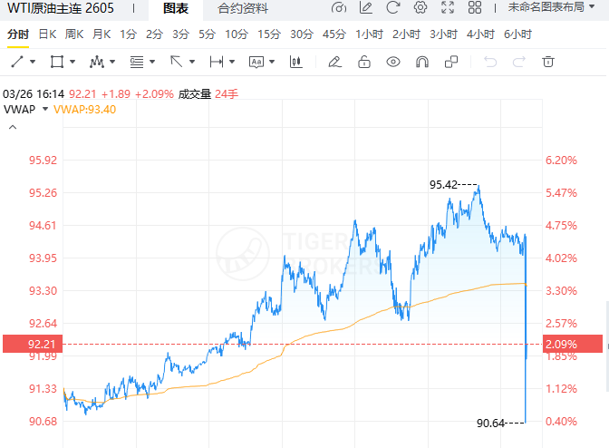 财联社3月27日电,国际油价短线跳水,WTI原油期货涨幅收涨至1.63%,报91.792美元/桶,此前曾涨超5%。