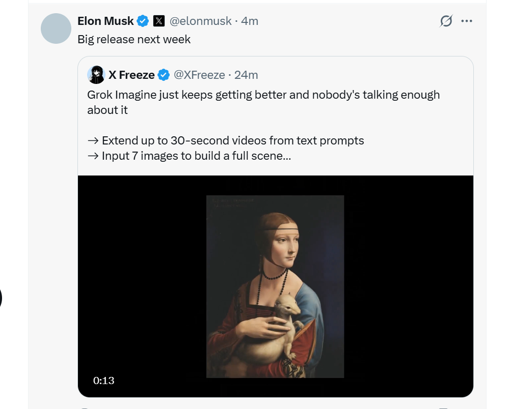 财联社3月27日电,马斯克在社交平台X上表示,Grok Imagine下周将有重大发布。