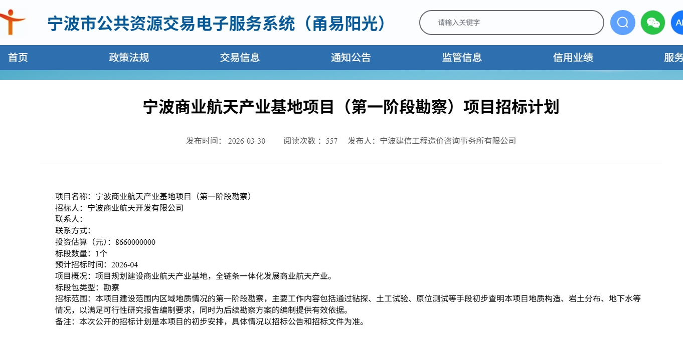 《科创板日报》31日讯,宁波市政务服务中心官网显示,宁波商业航天产业基地项目(第一阶段勘察)即将于4月开启招标。该产业基地预计总投资额86.6亿元,项目规划建设商业航天产业基地,全链条一体化发展商业航天产业。