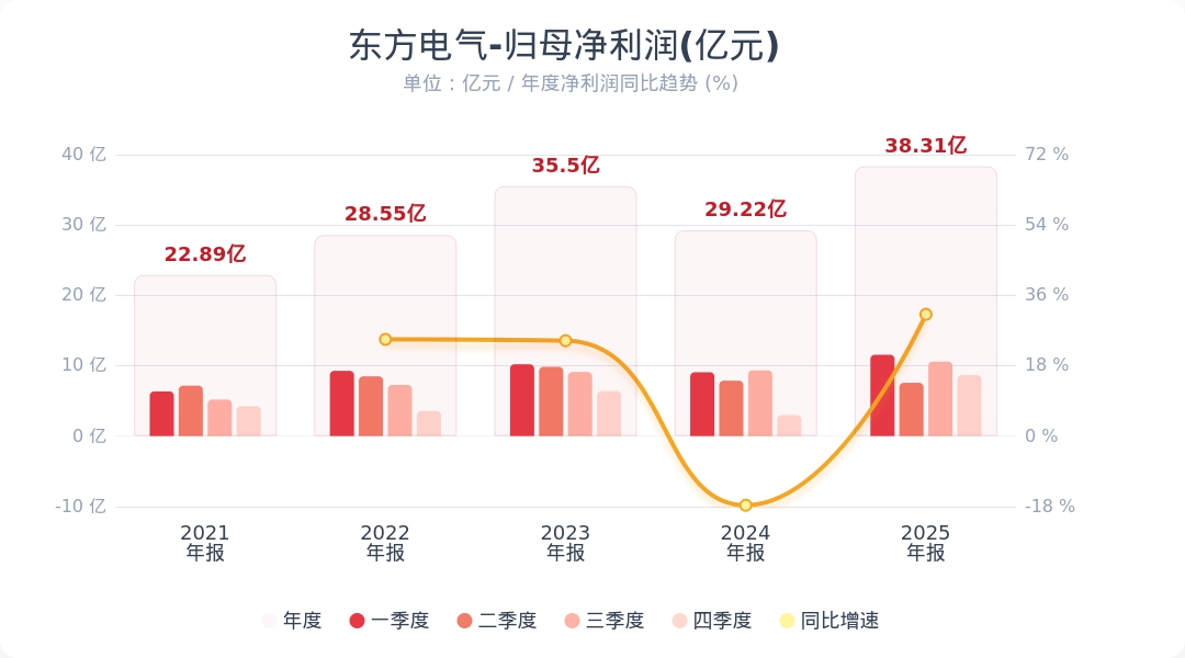 财联社3月31日电,东方电气(600875.SH)发布2025年年度报告,实现营业收入775.83亿元,同比增长13.11%;归属于上市公司股东的净利润为38.31亿元,同比增长31.11%。公司拟以当前总股本为基数,向全体股东每10股派发现金红利5.30元(含税)。小财注:Q3净利10.57亿元,据此计算,Q4净利8.65亿元,环比下降18%。