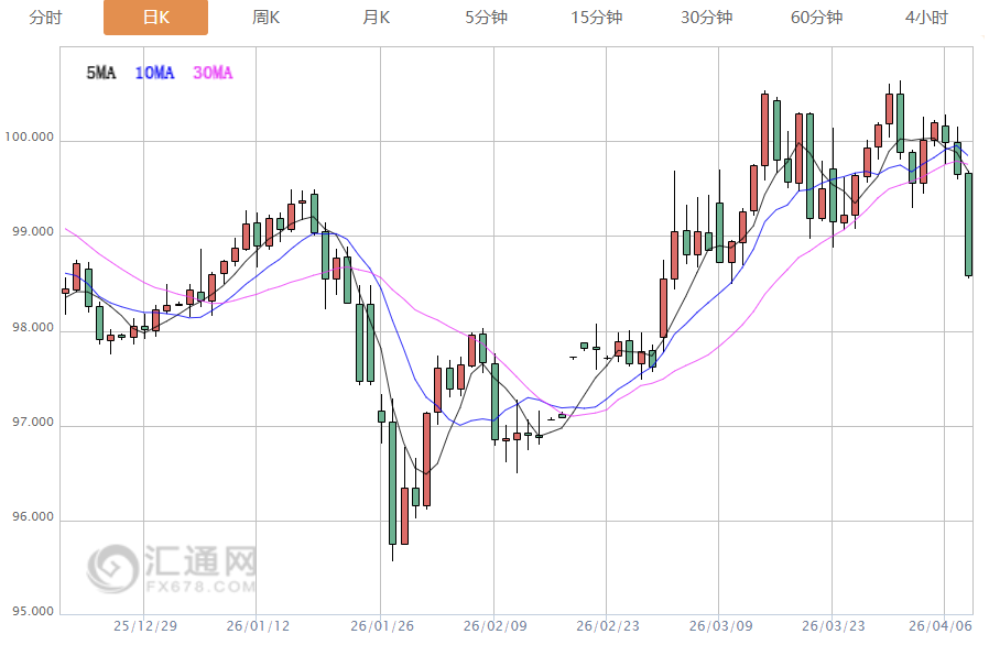 财联社4月8日电,美元指数跌1.04%,报98.63点,创日内新低,创1月27日以来最大跌幅,也抹去了今年以来的涨幅。原因是伊朗战争停火提振了全球风险情绪,推动所有G-10货币走高。美元/日元下跌1%至158.03,连续第二天走低;美元/加元下跌0.3%至1.3847,连续第三个交易日下跌;英镑/美元上涨1.4%至1.3482,创3月19日以来最大涨幅;欧元/美元上涨1.04%至1.1716,高于200日移动均线1.1673。