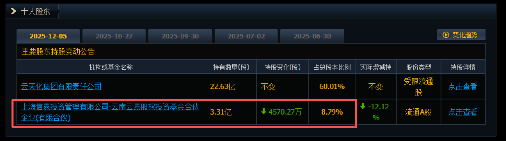 小财注:截至2025年12月5日,云南云熹位列国际复材第二大股东,持股比例为8.79%。